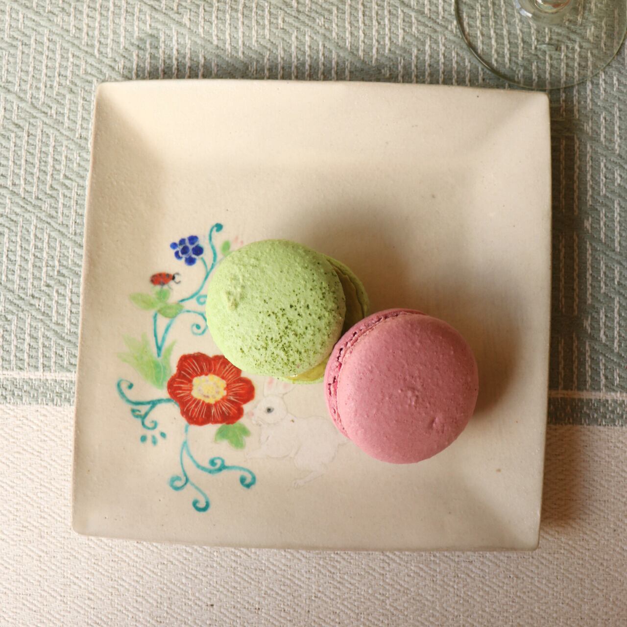 この可愛らしい絵皿は、優しい色合いで描かれたウサギと共に、愛らしい赤い花とつるの実のなる文様が特徴です。手作りのため、どの皿も一つ一つ異なる色合いや表情を持ち、心がほんわかと温かくなるデザインが魅力です。