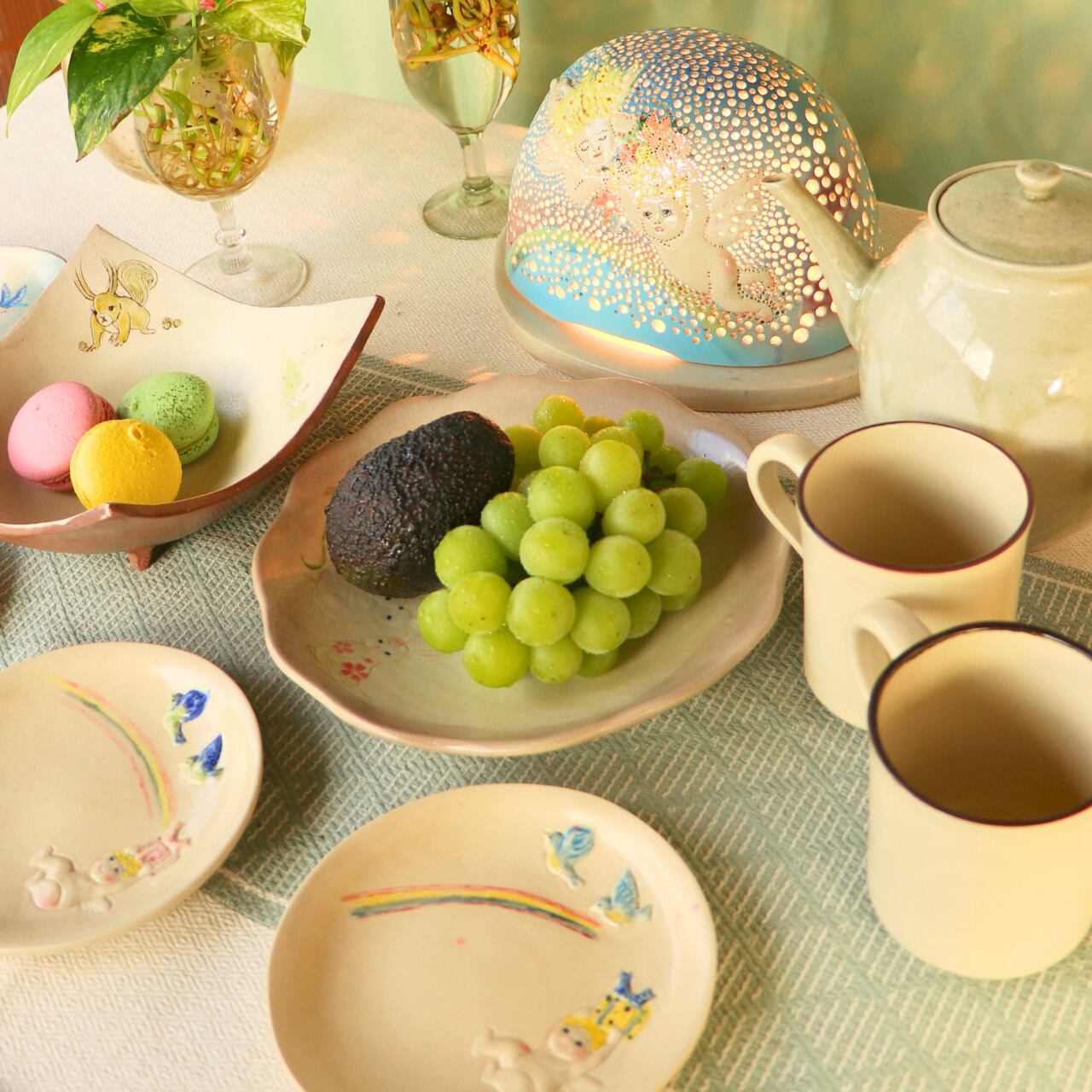 この素敵な絵皿は、足付きのデザインに、リスや水鳥の親子、うさぎ、そして夜空を見守るフクロウが描かれており、自然の息吹を感じさせる美しい作品です。その独特の雰囲気から、見る人の心を和ませ、食卓やインテリアのアクセントとして最適です。