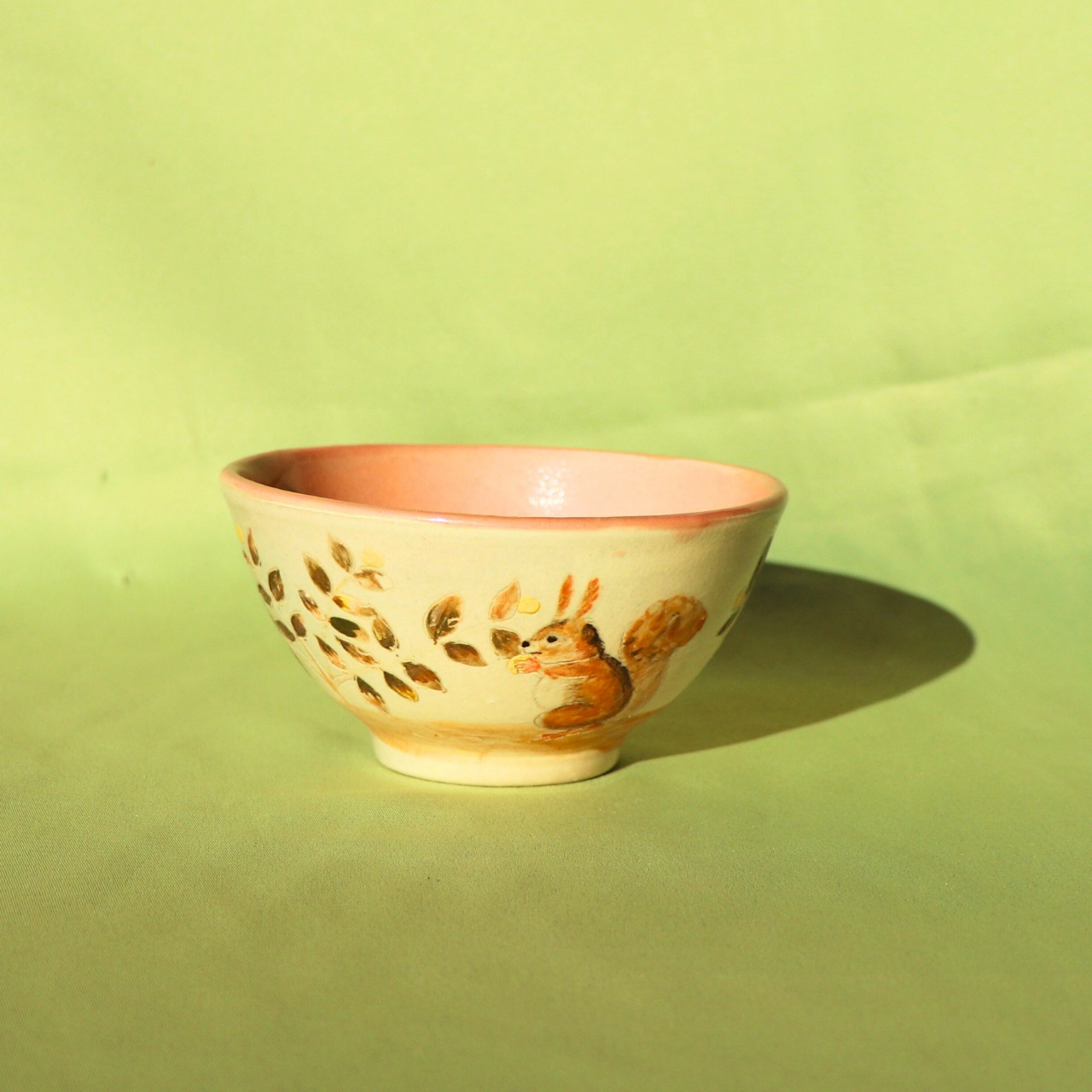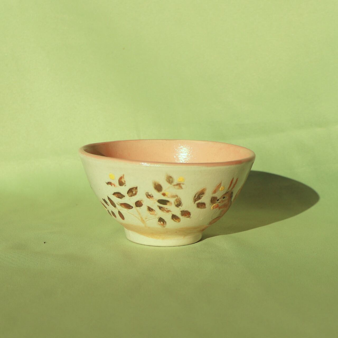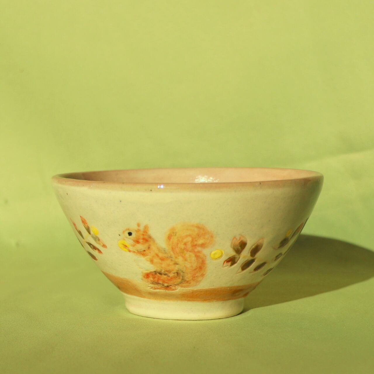 この飯碗は、手描きならではの温もりを感じられる美しいデザインが特徴です。秋の紅葉の枝の上で、元気よく木の実を食べるリスの姿が描かれており、四季折々の自然の恵みを感じさせてくれます。内側は淡紅色で、素朴ながらも優しさ溢れる雰囲気を演出しています。食卓を彩る一品として、毎日のご飯タイムをより特別な時間へと変えてくれることでしょう。