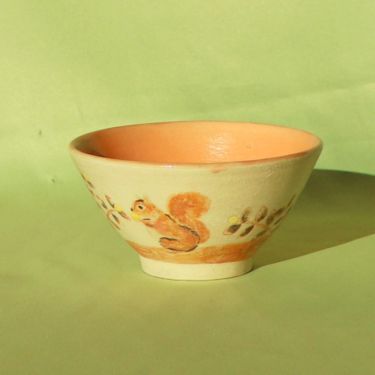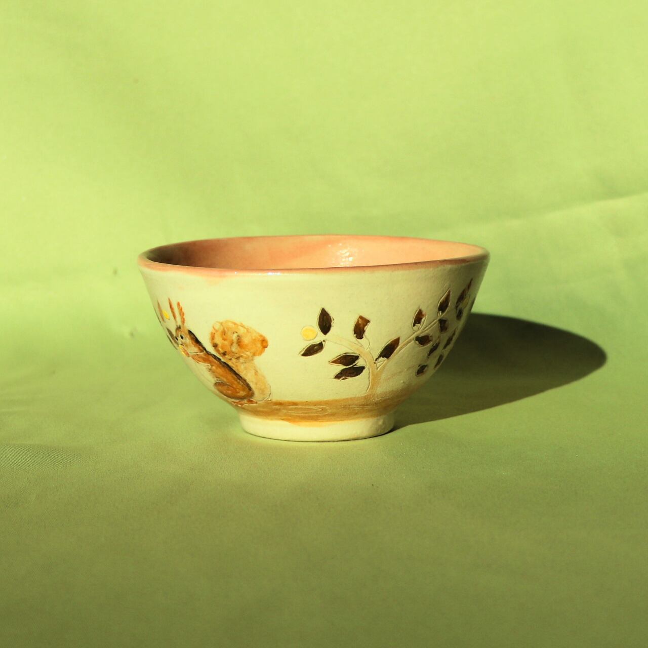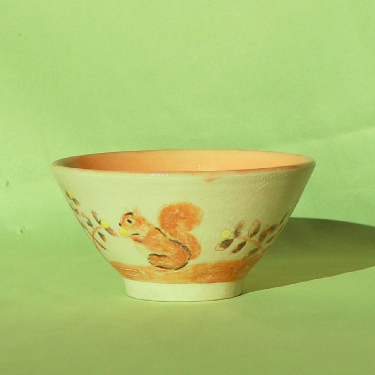 この飯碗は、手描きならではの温もりを感じられる美しいデザインが特徴です。秋の紅葉の枝の上で、元気よく木の実を食べるリスの姿が描かれており、四季折々の自然の恵みを感じさせてくれます。内側は淡紅色で、素朴ながらも優しさ溢れる雰囲気を演出しています。食卓を彩る一品として、毎日のご飯タイムをより特別な時間へと変えてくれることでしょう。