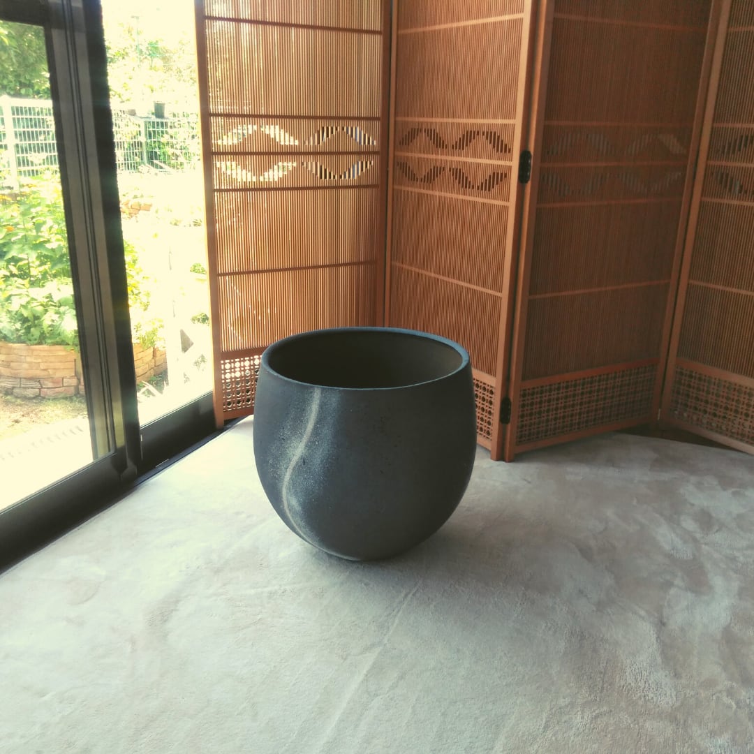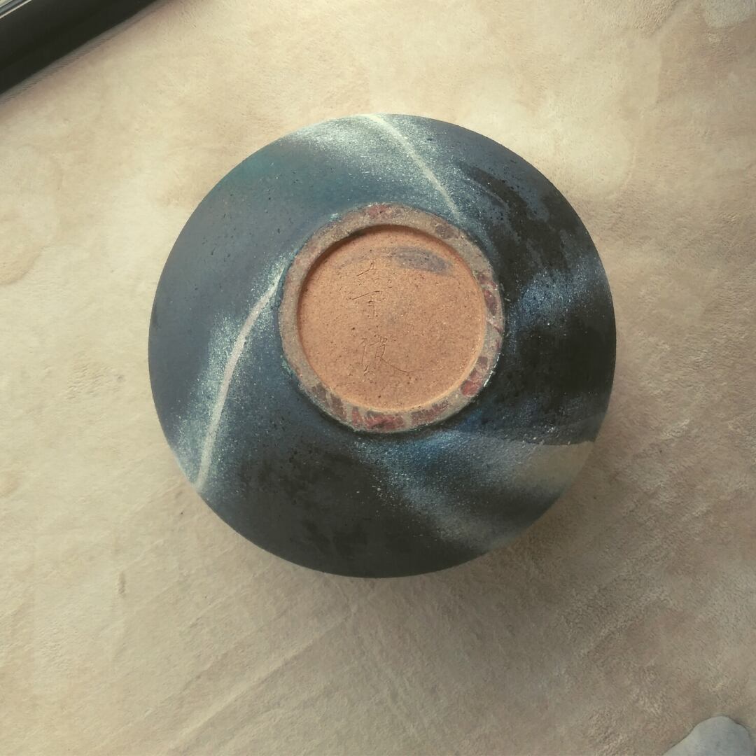陶器鉢作り方は紐作りで福岡県展入選作品です。まだ焼成前の作品に上からマスキングでデザインを浮かび上がらせそこに白と青い釉と他の数種の釉をブラッシングで描く点描法で、かなり特殊な方法での手間暇かけた制作です。内側はややマットな雰囲気です。黒い生地に載せた青が格別に美しく、白と少しピンクがかった色合いとがマットでおしゃれな風合いが魅力的な作品です。モダンでおしゃれ重厚感と豪華な雰囲気を持っています。